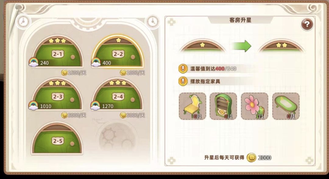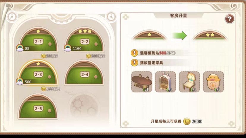 2星需要四个家具、温馨值540,收入2000