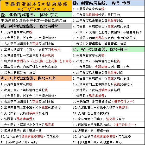 1.开局快速点完对话,然后不用去屋子右上角领私房钱,2.直接出屋向左走去找王允屋子里,到了屋子里拼手速快速点完对话,不要点王允也不要点貂蝉,3.马上出屋向右下角找城角小兵,快速对话,给他钱,4.然后马上去找吕布(中央皇宫后面),和吕布对完话进入密室,6.和董卓战斗胜利后副本结束,完成刺董结局,得称号铮臣。 整个过程手速快的话只需要1分钟,慢的话90秒,注意按照我说的步骤不必和其他没用的人对话。