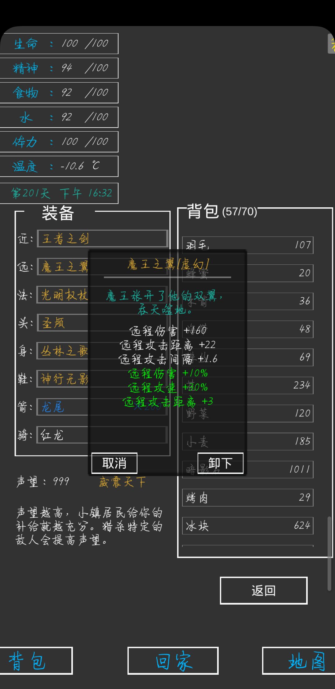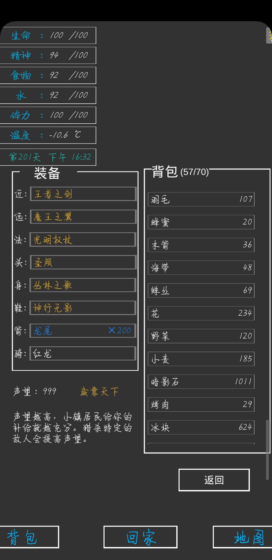 这种类型的单机玩过不止一了,这款还是挺有意思的,前提是有时间去折腾,时间零碎的话就不怎么友好,因为你再次回来的时候很有可能会没注意血量状态这些,武器后缀应该是借鉴了泰拉瑞亚的后缀近战传奇弓箭虚幻 法师武器我一直没做出来带后缀的 材料难打就没继续折腾了 鞋子属性最好的是祭坛换的那双(忘记名字了待会附图),还有个bug:建筑升级的时候手速快点能多卡一级,主要用于仓库,田和宠物栏 仓库多五格 多一块田 宠物容量多10,材料出处没特意记我记得有个老哥有帖子写了,各位自己找找,最后逼逼叨一句声望真难刷!