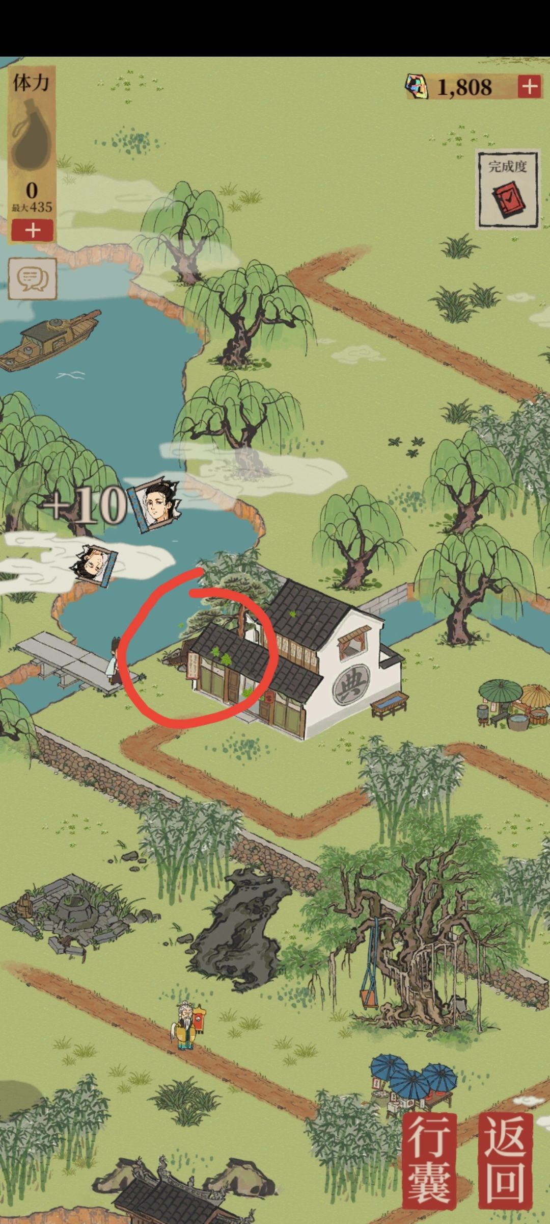 在这个图有几个标志性的东西被我点掉了 一个是摇钱树在左上角,那个补体力的泉水也在这个院子旁边。