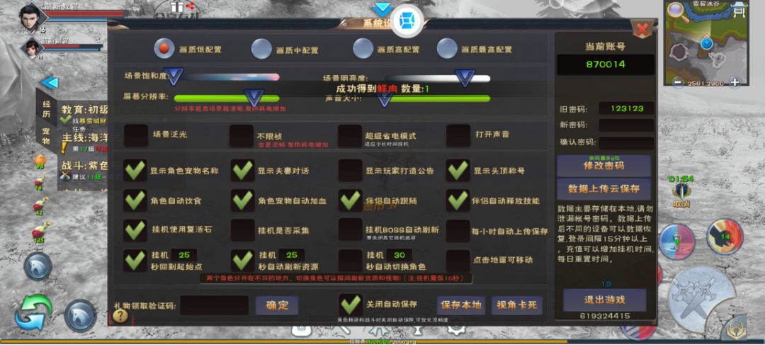 忘记了:哎呦我去,教官也失误了,但我是不会负责滴~忘记先告诉你们,把设置改成上图(手机好的可以改高配置),还有其他的设置可以自己随意,比如像“显示角色宠物名称”、“显示夫妻对话”、“显示玩家打造公告”,“显示头顶称号”这些,想去掉的也可以去掉。