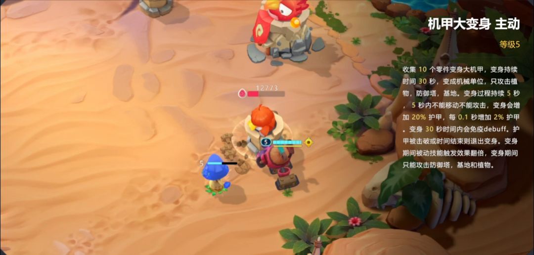 消耗10个零件,5秒后变身机甲,获得大量护甲并免疫不良状态,仅能攻击植物和建筑,被动技能效果翻倍。机甲最多持续30秒,护甲耗尽会退出变身并失去当前50%生命值。冷却30秒。
