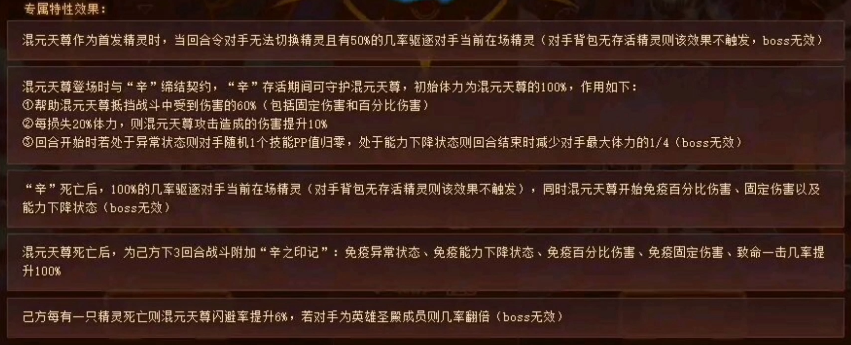 第三魂印,当辛死亡即蜕皮后,100%驱逐对手当前精灵,同时天尊免疫粉伤及弱化。蜕皮下的天尊,拥有极强的拦截能力,同样让对手胆寒。