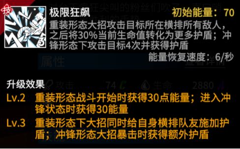 冲锋形态下,泉释放大招后会攻击当前目标4次,并获得少量护盾;大招攻击范围从横排缩小至单体,在残局下可有效避免横排难以命中多人的尴尬,让输出更加集中,更利于战斗后期收割翻盘。同时,大招的多段攻击可有效提高被动重击的触发频率,如果能达成满暴击,甚至每次大招后都会追加一次高额伤害的重击。大招升级后,泉进入冲锋形态就会立马获得30能量,有机会在刚转形态就释放大招造成大量伤害;大招提升到满级后,泉大招每次暴击都可获得额外护盾,在强化泉生存的同时可以进一步强化泉重击的输出能力。