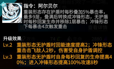 泉转入冲锋形态后,依旧会继承叠加的45%暴击率和护盾值;在冲锋形态下,泉每暴击4次会发动一次重击,对当前目标造成大量伤害。被动升级后,重击还会附带短时间的击飞控制效果,且自身护盾越高重击伤害越高,结合继承重装形态的护盾值可进一步提高伤害;被动提升到满级后,泉在变形后的8秒内攻击速度会极大提高,能在变形的初期就制造成吨输出。