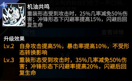 同其它效果,泉在两种形态下的专属效果也不相同:在重装形态下存在重装专属效果,有几率格挡伤害;在冲锋形态下则是冲锋专属效果,受到攻击时有几率闪避普攻,并在成功闪避后回复生命。相信大家对重装和冲锋的专属被动都比较了解,这里就不再说明。专属中额外提供了攻击和暴击率,在重装形态用处不太大,而在冲锋形态下可进一步提高输出能力。