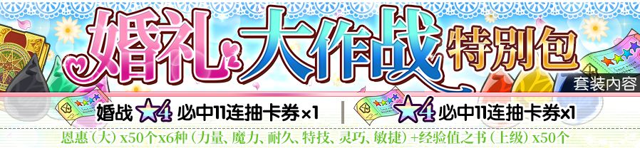 礼盒奖励:婚战★4必中11连抽卡券*1、★4必中11连抽卡券*1、恩惠(大)*50个*6种(力量、魔力、耐久、特技、灵巧、敏捷)、经验值之书(上级)*50个