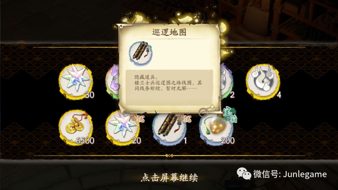 图片位置得到物品巡逻地图,和8-4的机关图齐全后,回营地对话呼延崇开启隐藏关卡七曜之廊,完成后得到1抽。