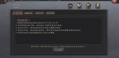 全新版本中的军团战可谓是充满了刺激与冒险。想要在军团战中大获全胜,除了睿智的策略,还要有相互配合默契的成员,正所谓“上阵父子兵,打仗亲兄弟”。军团战中相互配合的契合度也是一大窍门呢~打开世界大地图进入到军团战的页面我们可以看到,军团战分为四个阶段分别是,报名阶段、数据同步、战场开启、奖励结算。