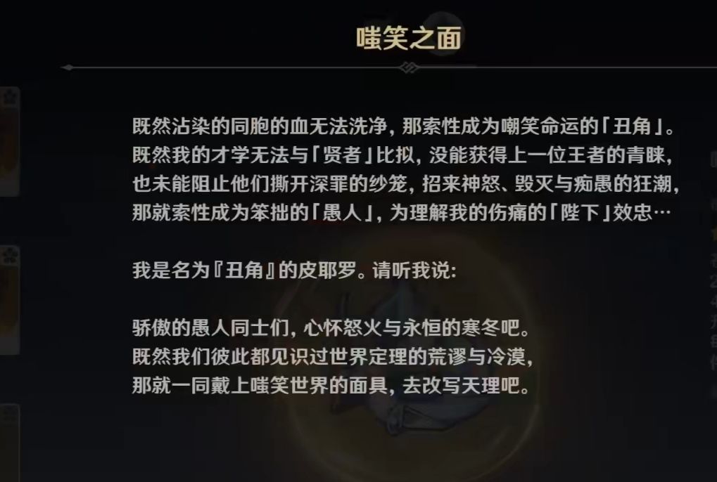 【博士】这个很好猜,做人体实验的也就这个大BT,本人似乎是须弥人,是被【丑角】找到后才带回至冬的,然后现在的先遣队改造人和他们的武器,还有邪眼,独眼小宝工厂,全是这家伙整出来的。