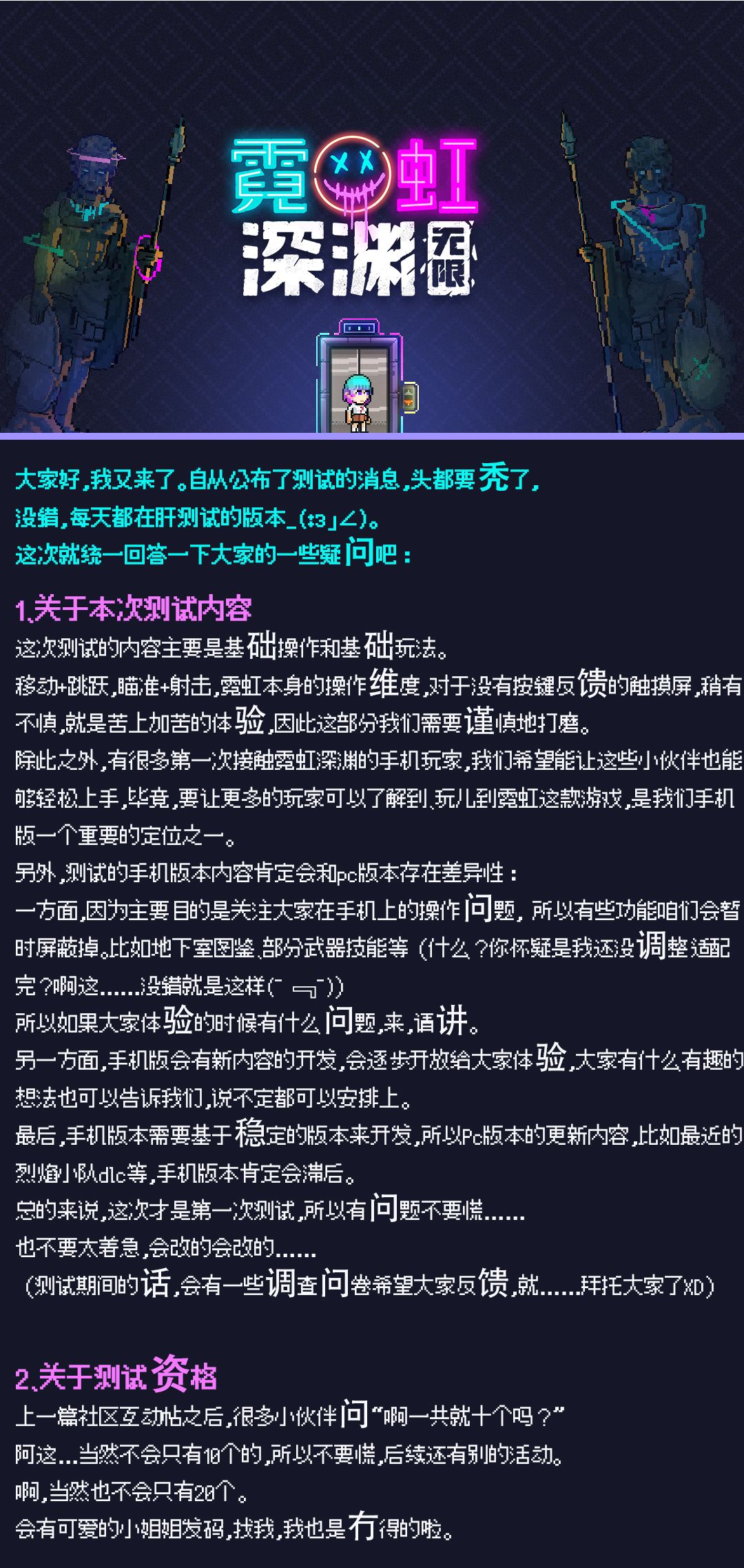 纱夜在此再次感谢各位冒险家对《霓虹深渊:无限》的关注和支持,测试筹备正在紧张有序地进行中!相信很快就会跟大家见面(ノ゚▽゚)ノ祝大家假期愉快!