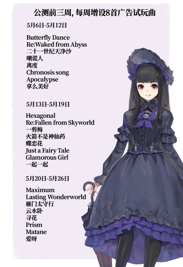 2.公测前三周,将选取8个收费曲包,且每个曲包选一首歌曲供玩家限时免费游玩。(广告试玩曲)