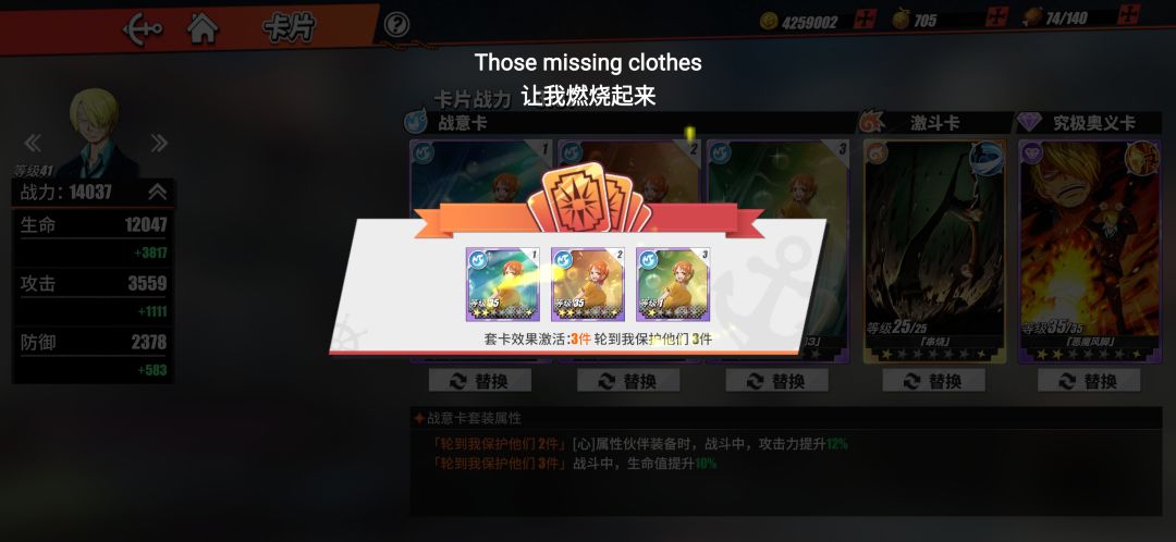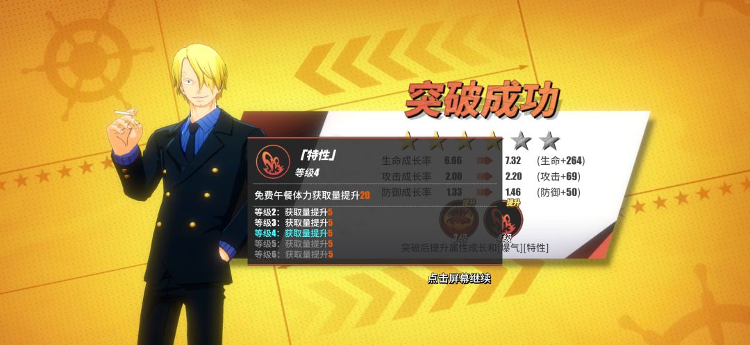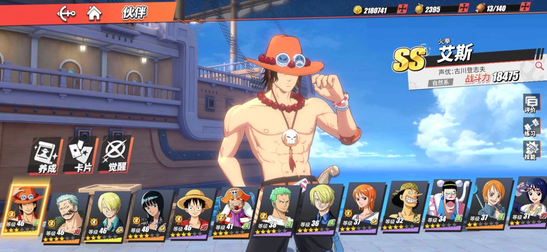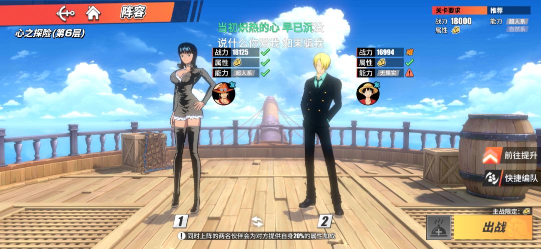 主要养Ss人物,接着看缺什么属性去找下位S,比如我技Ss就养S心和S力,因为有指定属性副本,所以要养两个各属性人物,所以要养6个,但是Ss很强所以就养另外四个力和心属性,这边是送的Ss黑足山治,加上抽的罗宾和烟鬼,路飞强度还可以,正好一个队。