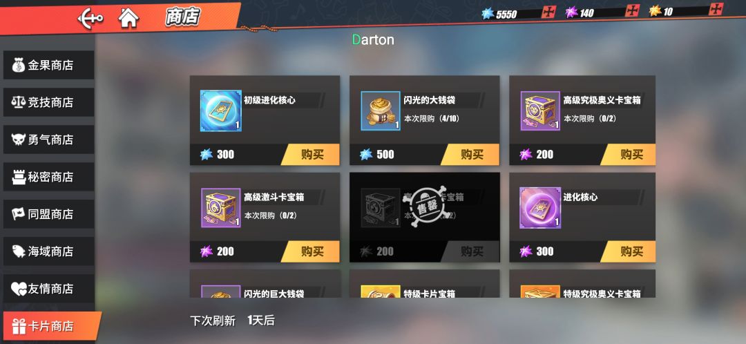 前期主要买高级战意卡箱,运气好凑齐三连套,主c队伍三件套都齐了后兑换进化核心。