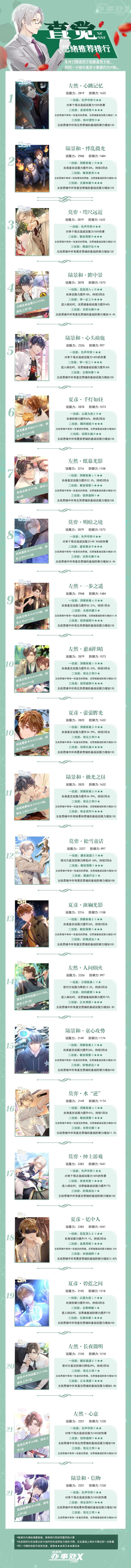 这一版本的思绪推荐排行榜是我们从开服时就一直坚持做到现在的,当时考虑到律师们推主线和异常时,主要会根据关卡属性组建对应的卡组,是基于卡牌在相应属性卡组中所能发挥的作用进行排序的。但近期的多个活动关卡,都弱化了对卡组的属性要求,许多单推律师都是根据角色来组建卡组的,近期的活动卡也大多以角色加成卡为主。因此,最近我们正在基于卡牌对角色卡组的加成作用指定一份新的思绪推荐排行榜,以满足不同律师的诉求,敬请期待~