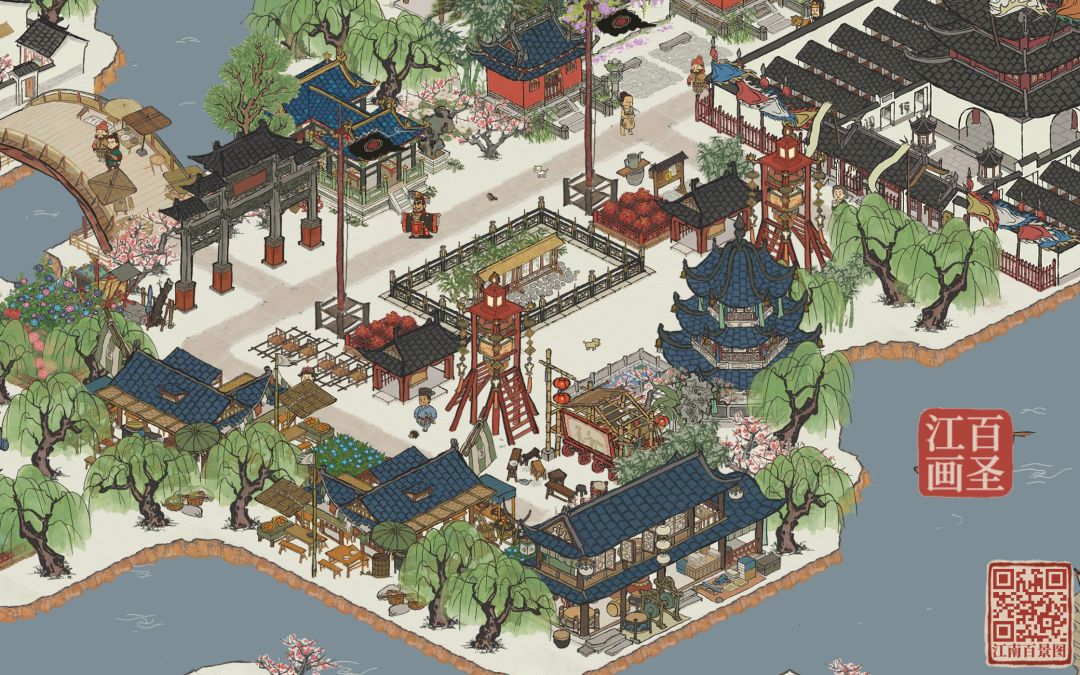 ch茶楼邻水而建,可以一般品茶,一边欣赏美景。畅音楼和皮影戏为人们带来文化娱乐享受。南北行也建在河边,方便往来商船停泊,它里面出售各种生活用品和特产。