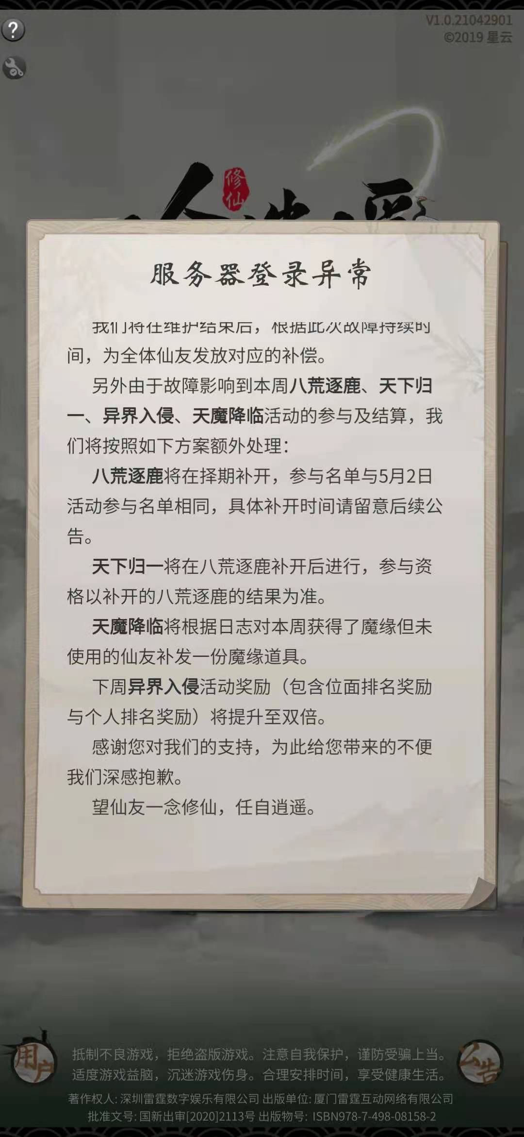 关于这次游戏出现的问题,我就不多说了,了解到雷霆其他游戏也出问题了,但是直到我看到了后续公告