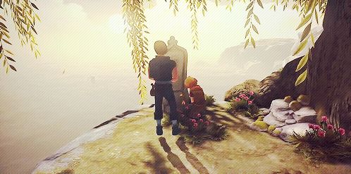 除了合作解谜的玩法之外,游戏中也有不少体现兄弟俩相互照顾的温情一面。如因为童年阴影而怕水的弟弟无法单人涉水,需要趴在哥哥背上才能渡河;利用体型优势化解困难的弟弟,也会积极地寻找身边一切可利用的道具帮助哥哥。