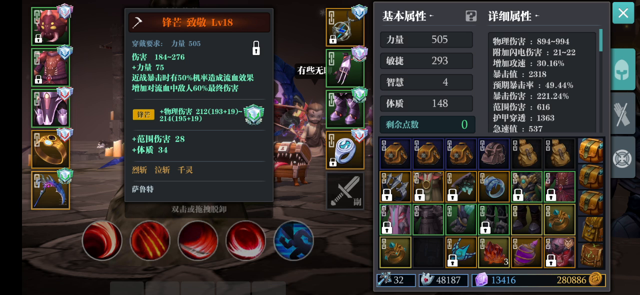 目前常规配装在高强化下也就这样,除非还有其他玩家开发新配装,比如镰刀用生命打击加八重切。。。