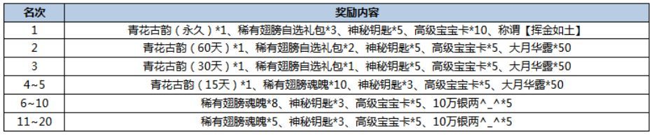 一掷千金活动时间:5月4日10:00:00-5月17日23:59:59活动描述:活动结算时,充值前20名玩家可以获取丰厚奖励哦~奖励配置: