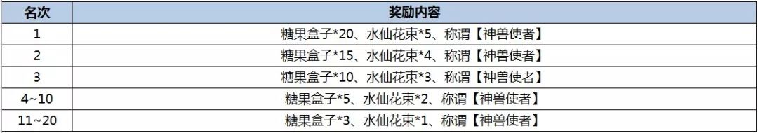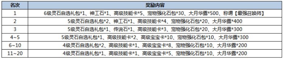 最强神宠活动时间:5月4日10:00:00-5月17日23:59:59活动描述:活动结算时,召唤兽战力最高的20名玩家可以获取丰厚奖励哦~奖励配置: