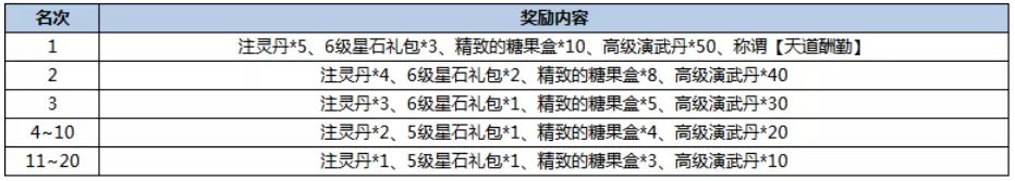 新服冲级活动时间:5月4日10:00:00-5月7日23:59:59活动描述:活动结算时,等级最高的20名玩家可以获取丰厚奖励哦~奖励配置: