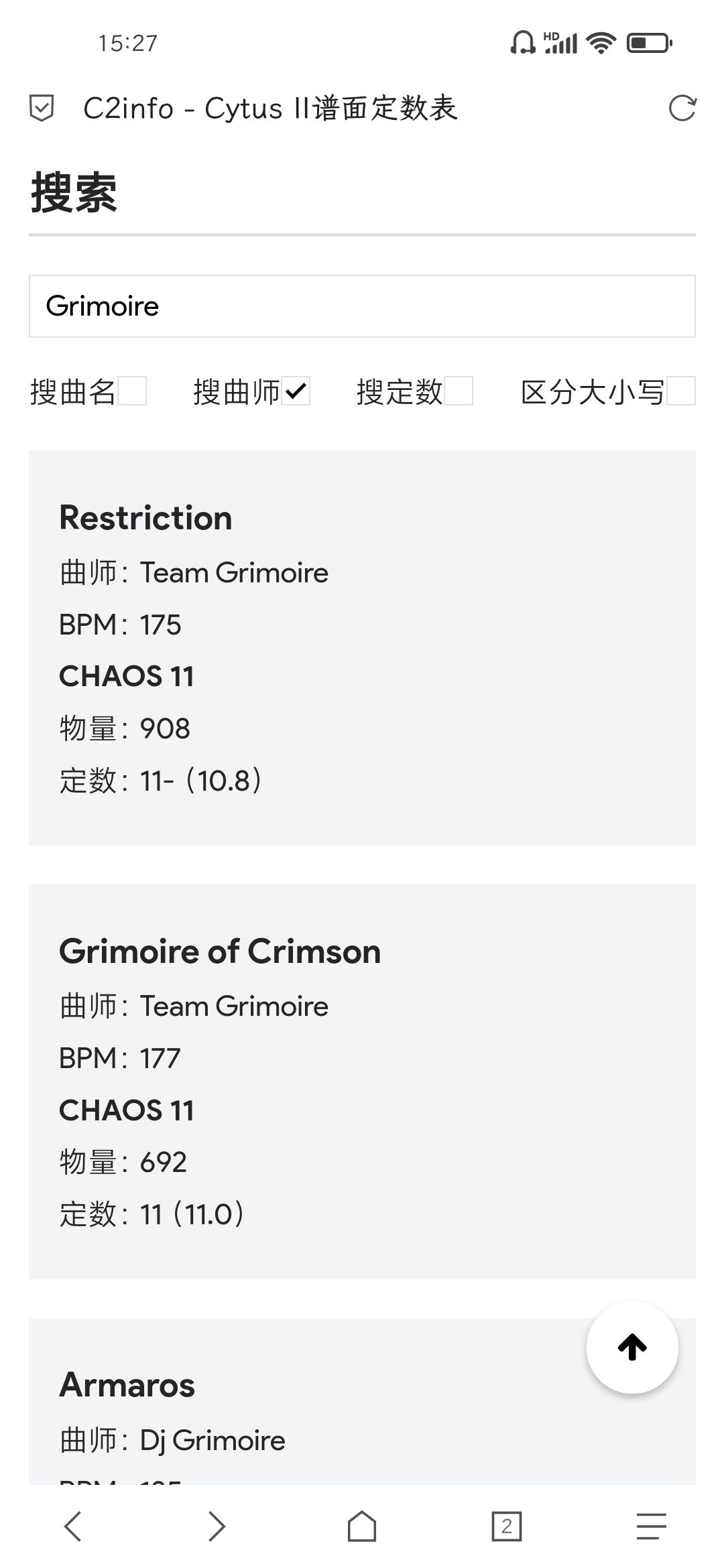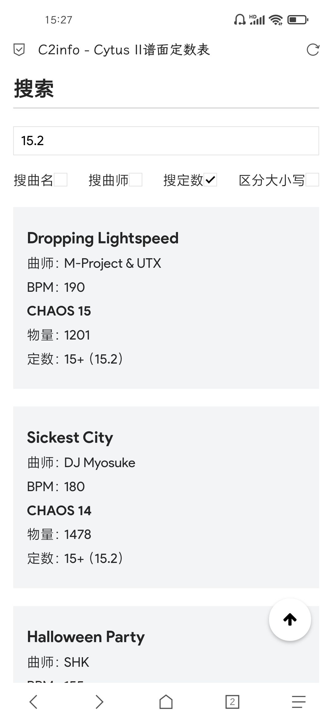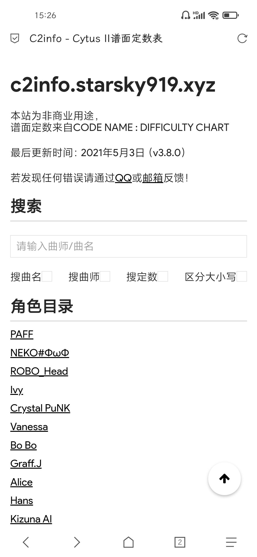 支持简单的搜索功能,可以搜曲名、曲师和谱面定数;支持快速跳转和返回顶部。