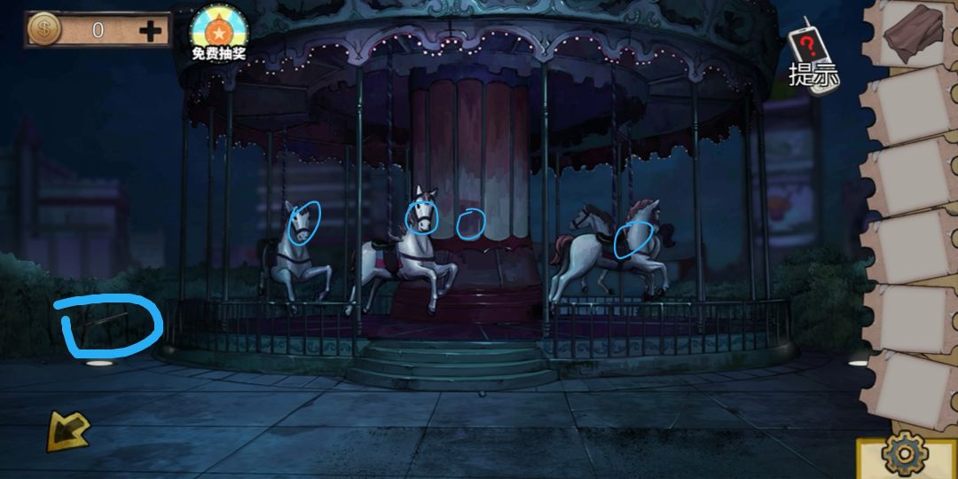 22、在旋转木马处对污渍使用汽油,用抹布擦干净得到密码49172,可以打开摩天轮一楼的门。