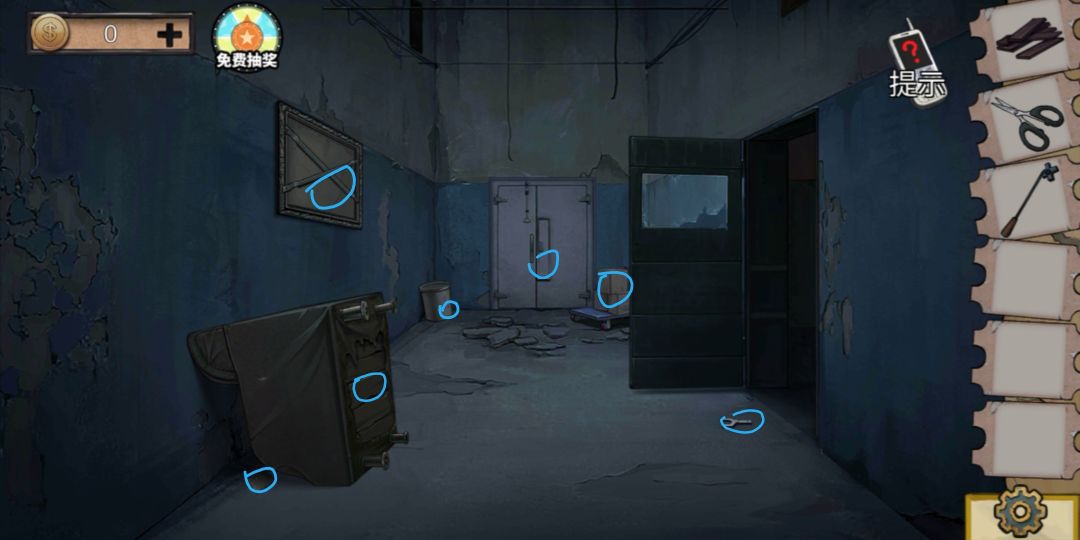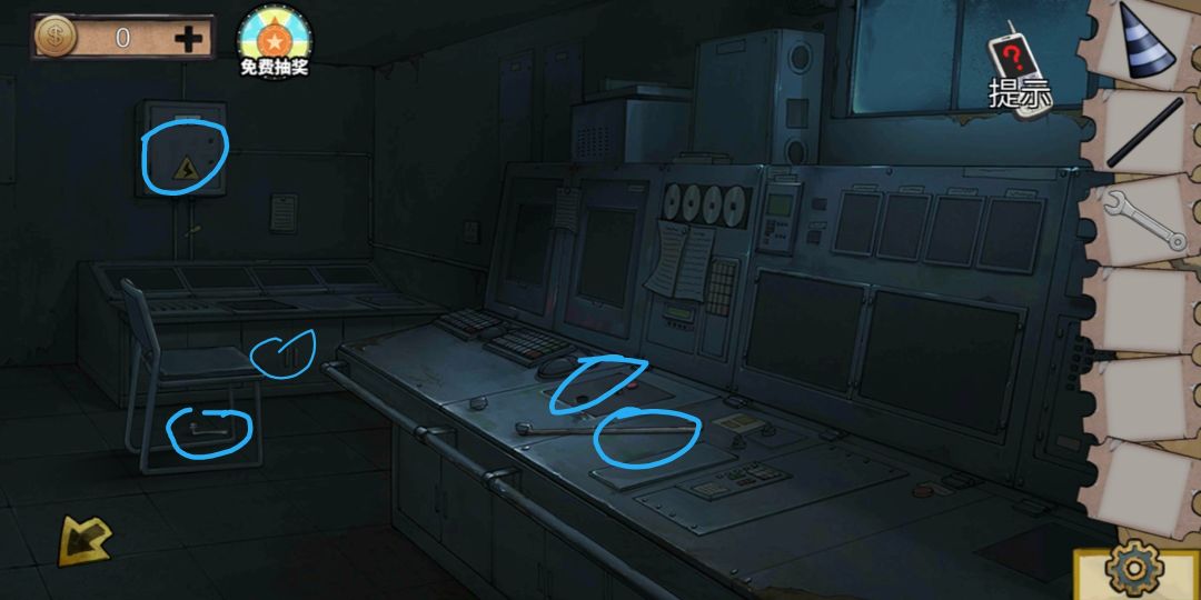 门是从外面锁着的(没用的信息)。桌子上可以得到螺丝刀。左边的抽屉是锁着的,右边的抽屉可以打开,得到蜡块。墙上的纸上有数字垃圾桶是被胶水粘住的。闸刀提示没有电。