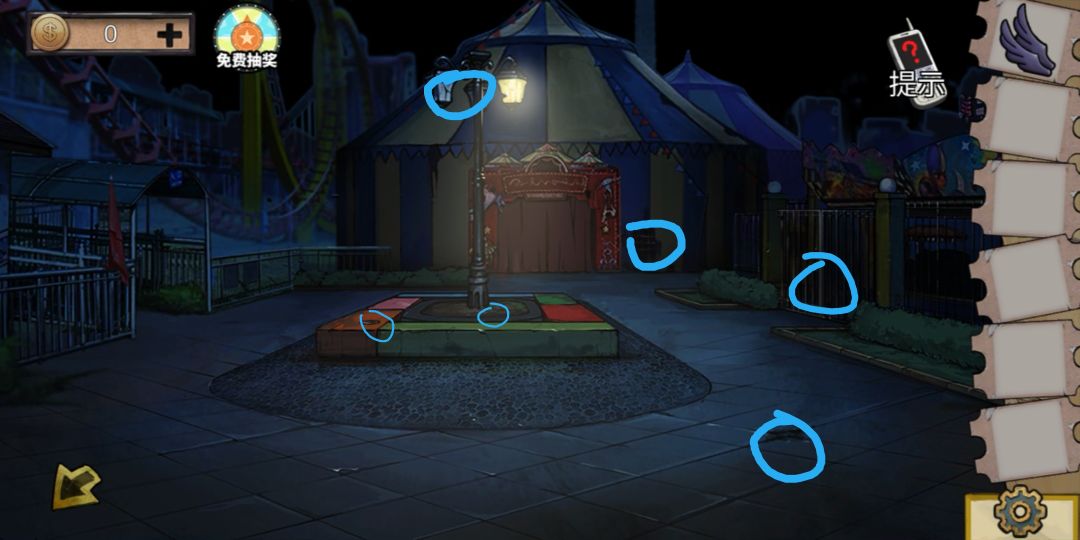 38、鬼屋门口。在鬼屋门上的机关上使用圆形发光物,结合摩天轮发光颜色,打开机关。