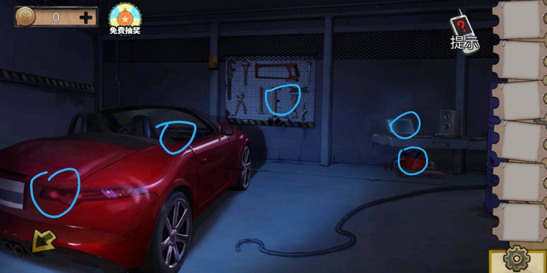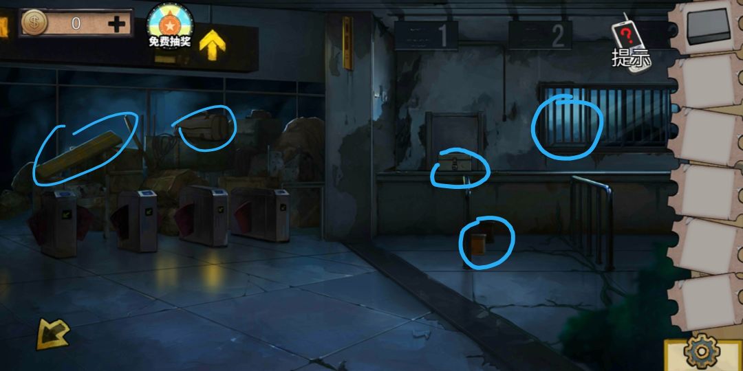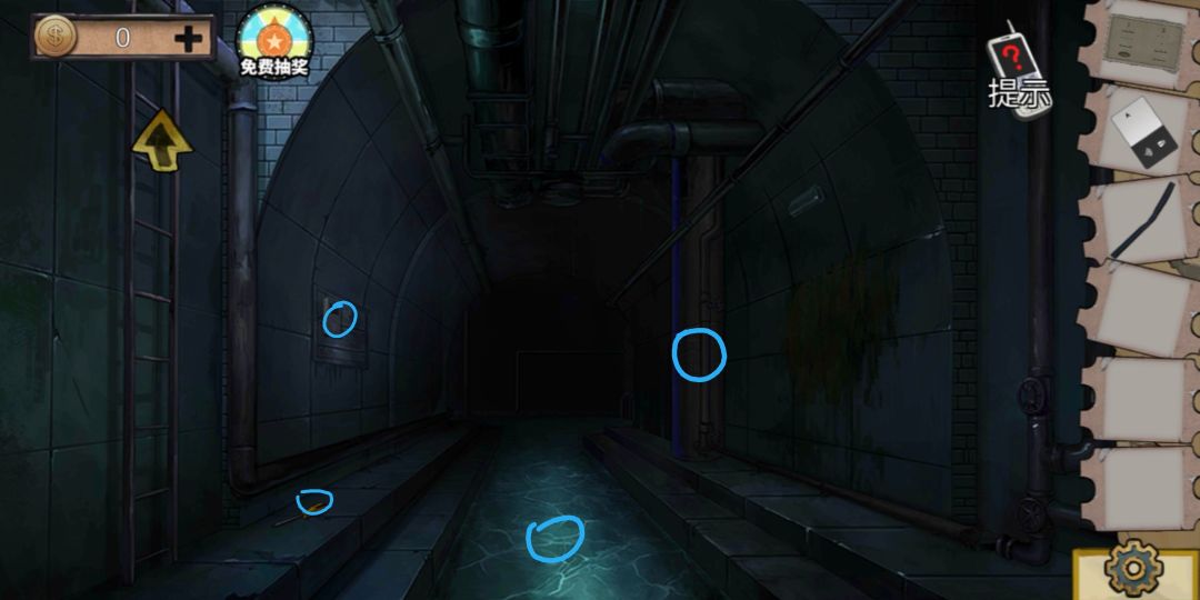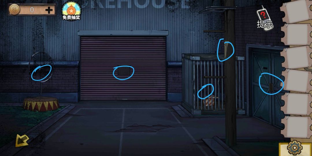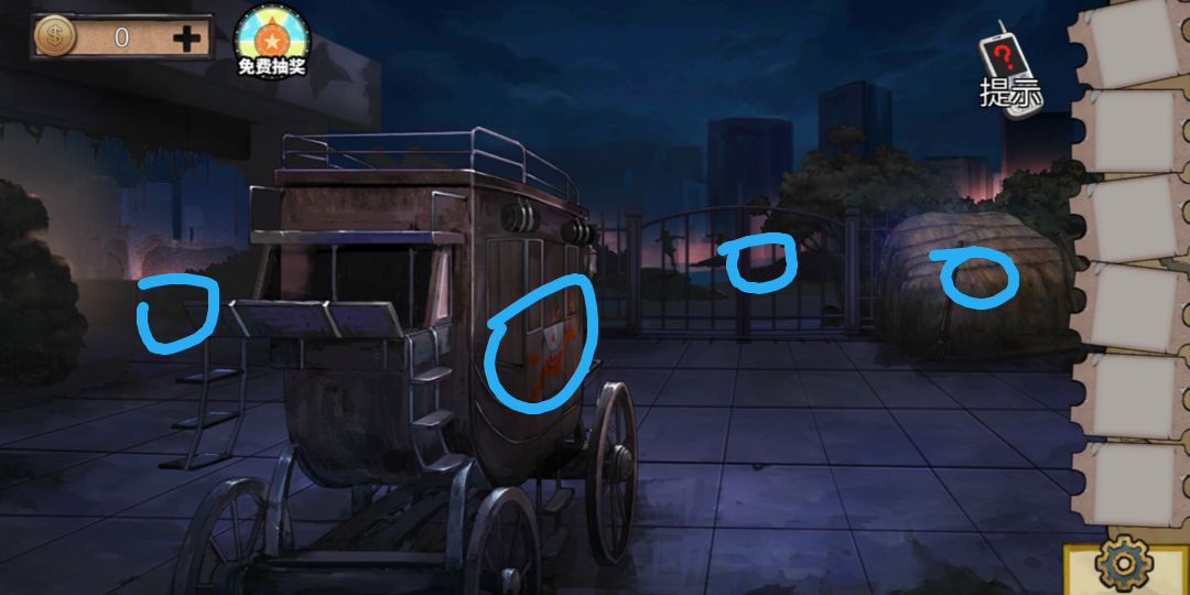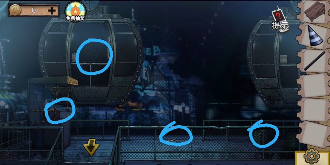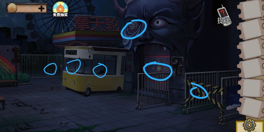 可以得到:铁门上有锁;车推不动;毛巾和拿不到的篮子;鬼怪眼睛上有图案;鬼屋门上有机关;拉了胶带的路。