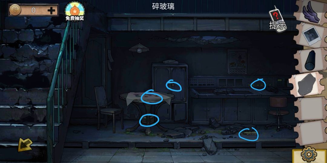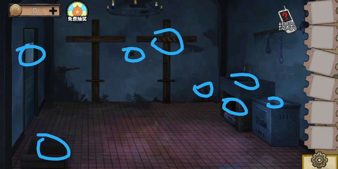 门右边位置得到飞刀;右边高台下面使用把手放下楼梯;左边高台上有个密码盒,还有绳子(可以用飞刀剪断,剪断后地上捡到锤子);右边高台上有男孩型状的铁片;门上有机关。