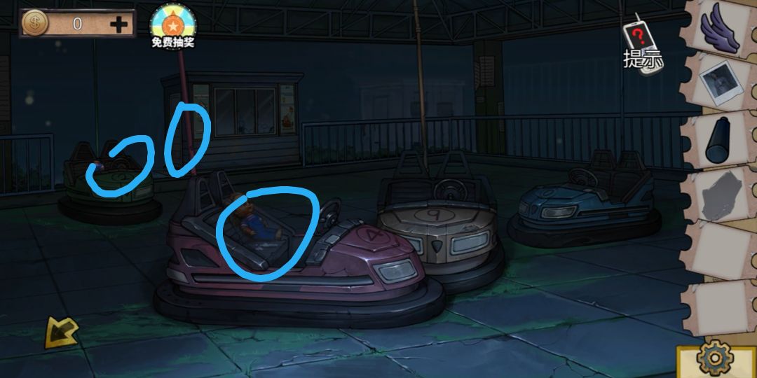 红车上使用碎玻璃得到钥匙;绿车上得到玩偶头;后面门里得到机关。