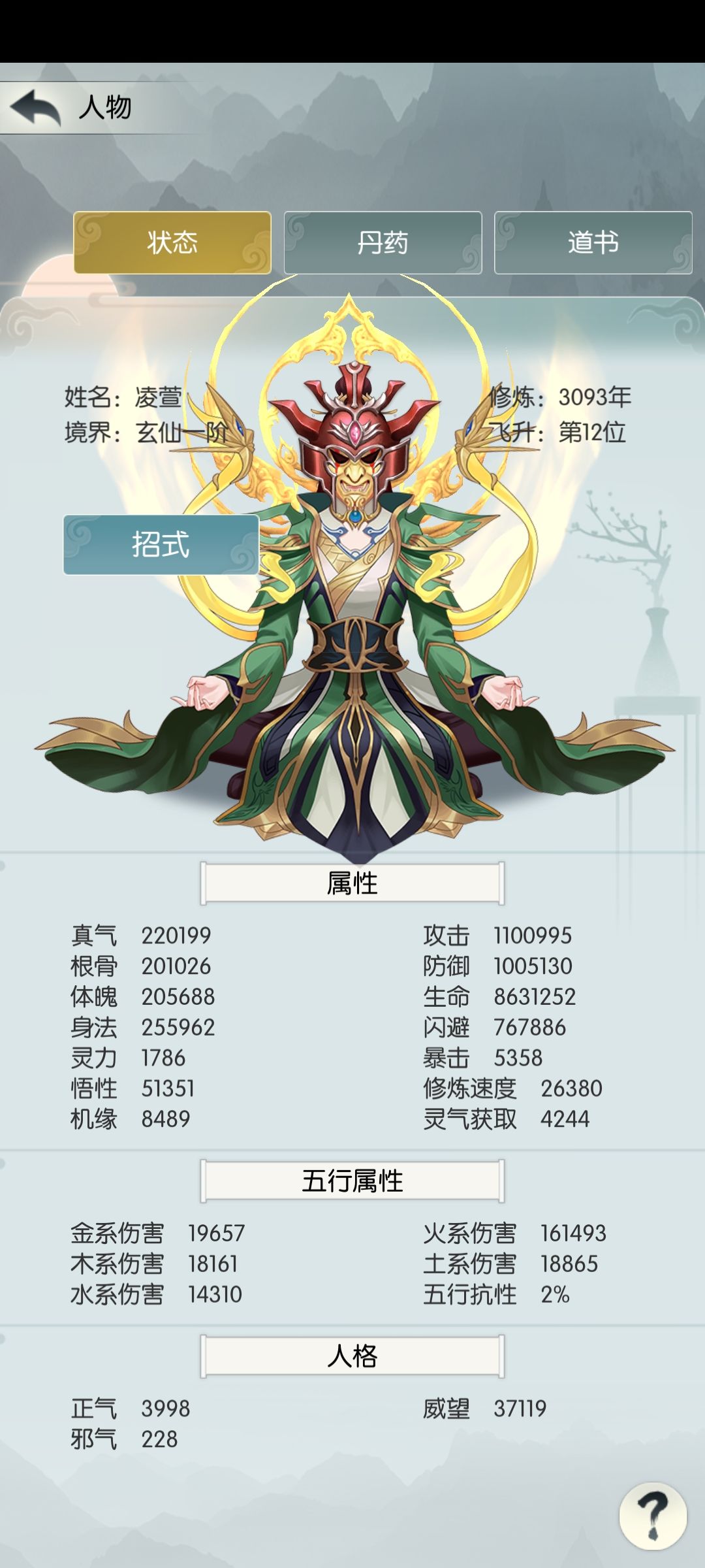 5、招式大概算我们那个区最多的那个了(毕竟其他人都在换门派妙法),身法和真气的buff招式都有,我这套主要是为了偷图加快发育,没想走身法,技能一个没升。手里威望只够先买一个五鬼,后面买丙火和紫莲、五神固岳。