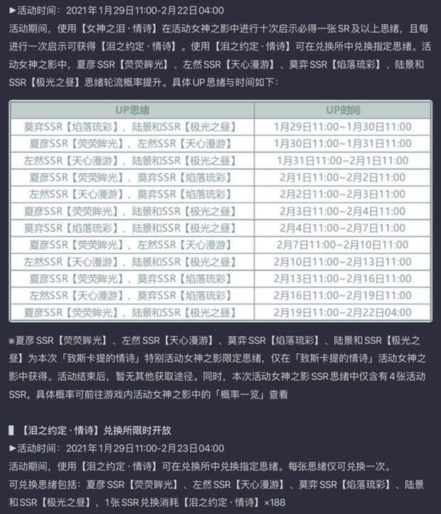 限定池:4限定卡,国庆春节周年(?)限定,四卡概率轮流提升,不进轮替池,使用限定泪和限定泪约