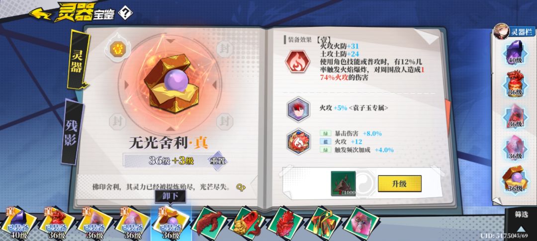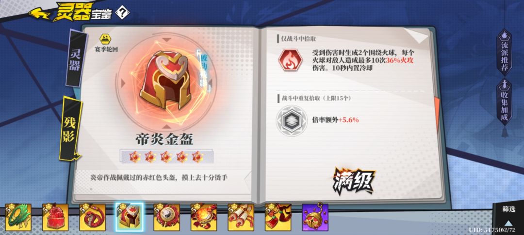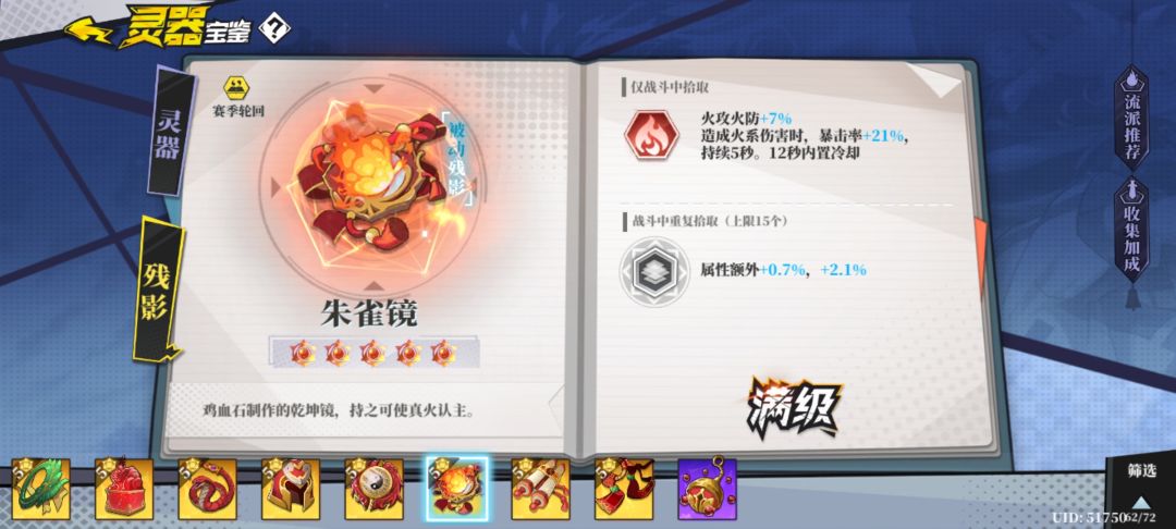 推荐火系标配五件套,提供火攻,暴击和直伤。核心灵器是无光舍利和黑晶。