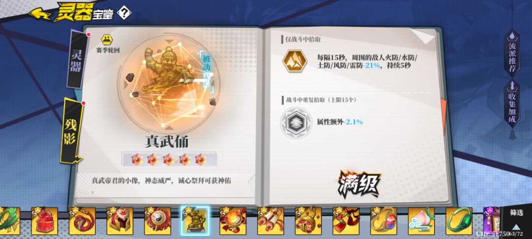 另外残影的空位根据你所卡关的boss而定,比如卡关慕容就带水抗头盔,卡关麒麟就带土抗。清小怪乏力就带师刀。