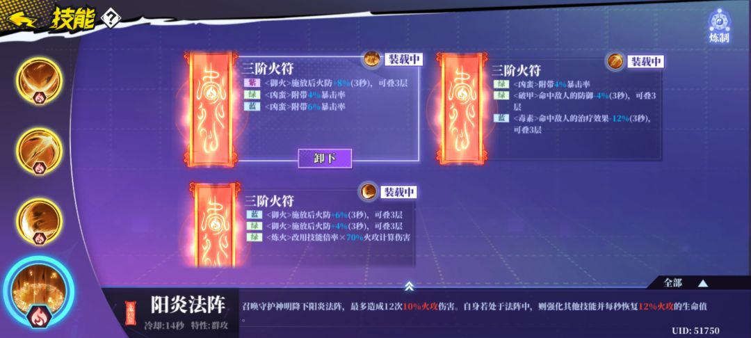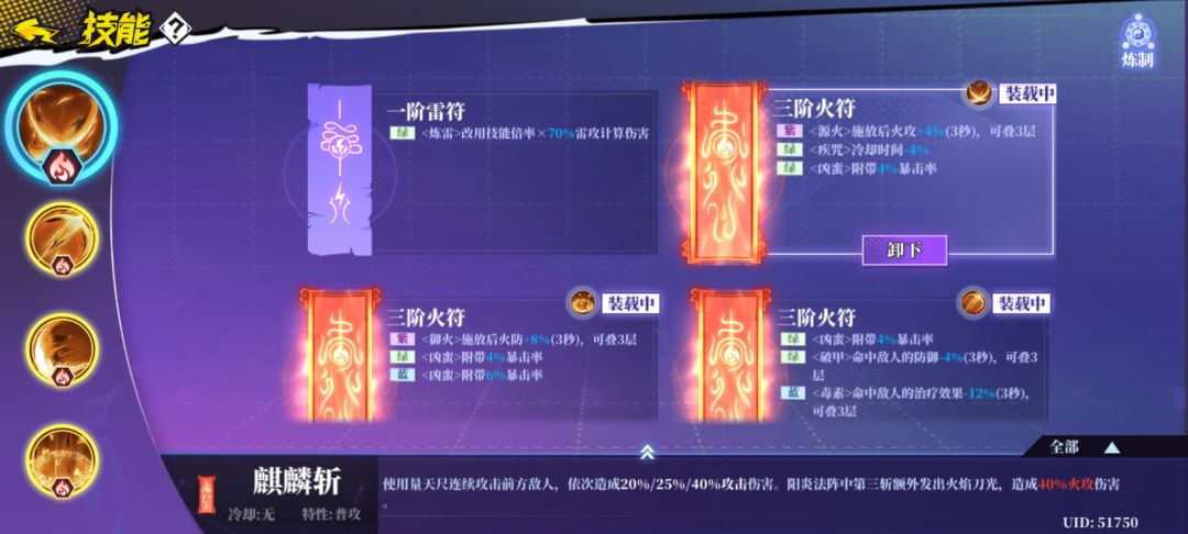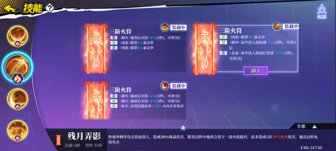 四件符推荐都有炼火(转化为火属性伤害),普攻要有源火(增加火攻),一二三技能要带双咒(技能可以使用两次,冷却时间增加)