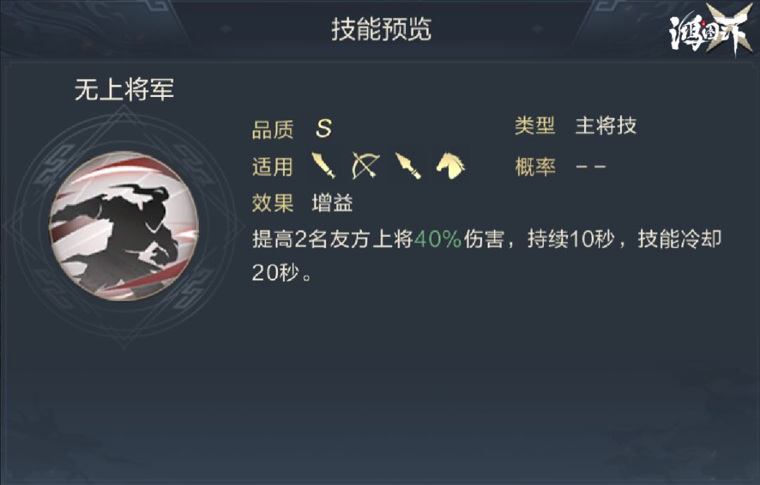 在属性提升的基础上,灵帝的主将技可在发动后的十秒内提升友军上将40%的伤害,综合提升后能造成远超五星武将的伤害值,并且主将技的初始CD最短可为6秒,会远超配置技能的发动速度,即使以灵帝1.58的速度成长释放,也可保证百分百在队友释放技能前释放,所以该技能的提升对主动技能非常稳定,对连击技能比较稳定。