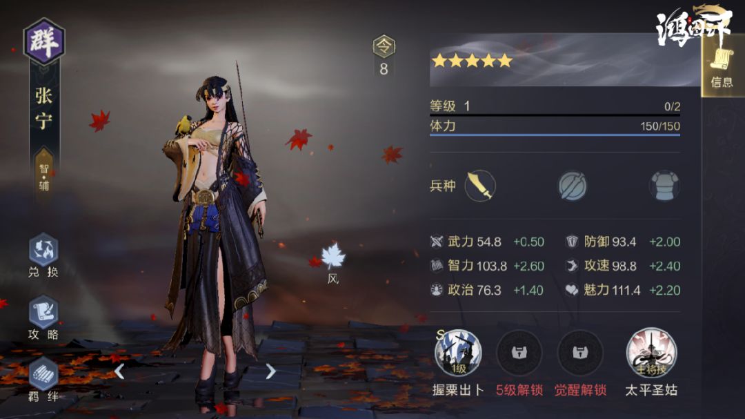 张宁的整体属性比较优秀,作为步兵武将,她拥有不错的速度与智力成长,防御成长更是超越了大多数智力武将,虽然定位为辅助,但凭借较高额速度与智力也有一定的输出空间,可适应多种搭配需求。