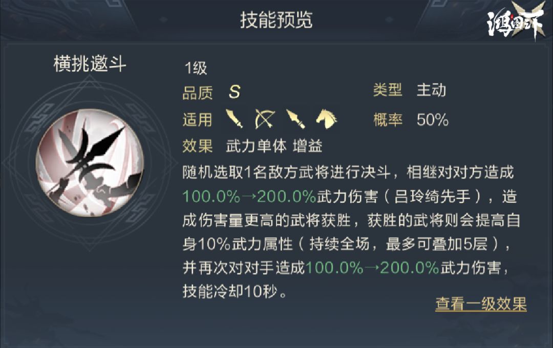 吕玲绮的自带技能让她和1名敌人进行决斗,先后对对方造成一次武力伤害,然后根据伤害量的高低给予武力加成和额外伤害。