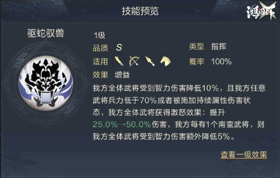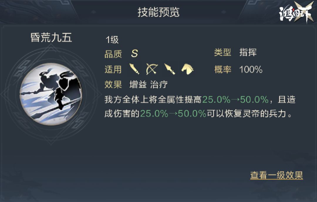 灵帝的技能只可对上将生效,能够在实战中提升己方上将一半的属性值,并利用上将造成伤害的50%恢复兵力,仅从这点来看似乎只是把上将的基本属性提升到了齐平名将而已,所以有必要额外提一下他的主将技能。