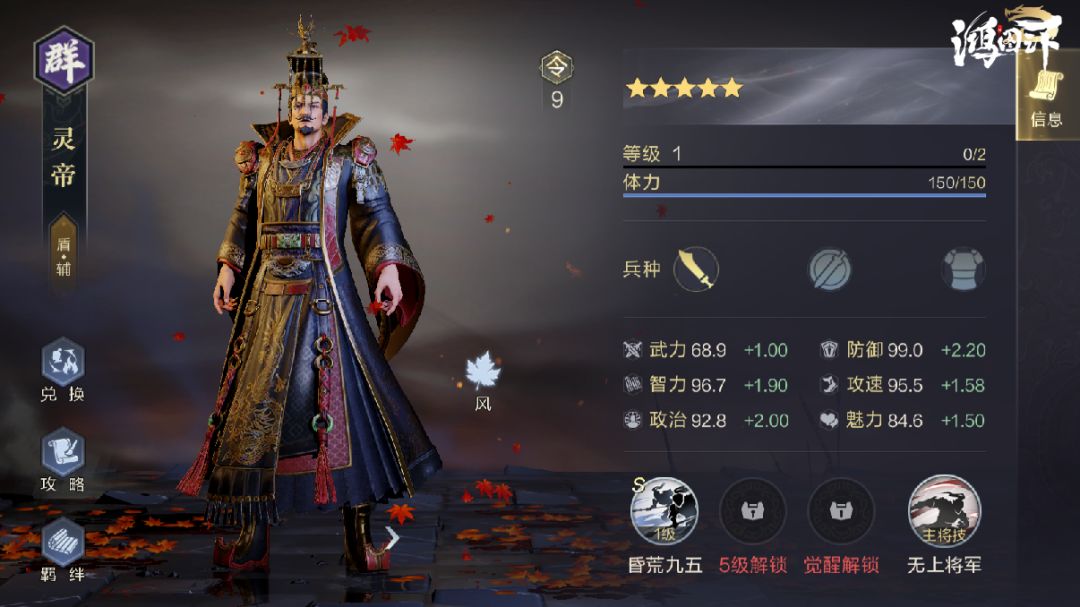 灵帝的防御成长比较优秀,可担任前排位置,这与他的兵种和定位刚好符合。作为9令武将自然有他的独到之处。灵帝的属性虽然不算拔尖,但他的技能可是最有机会改变鸿图PVP环境的技能。