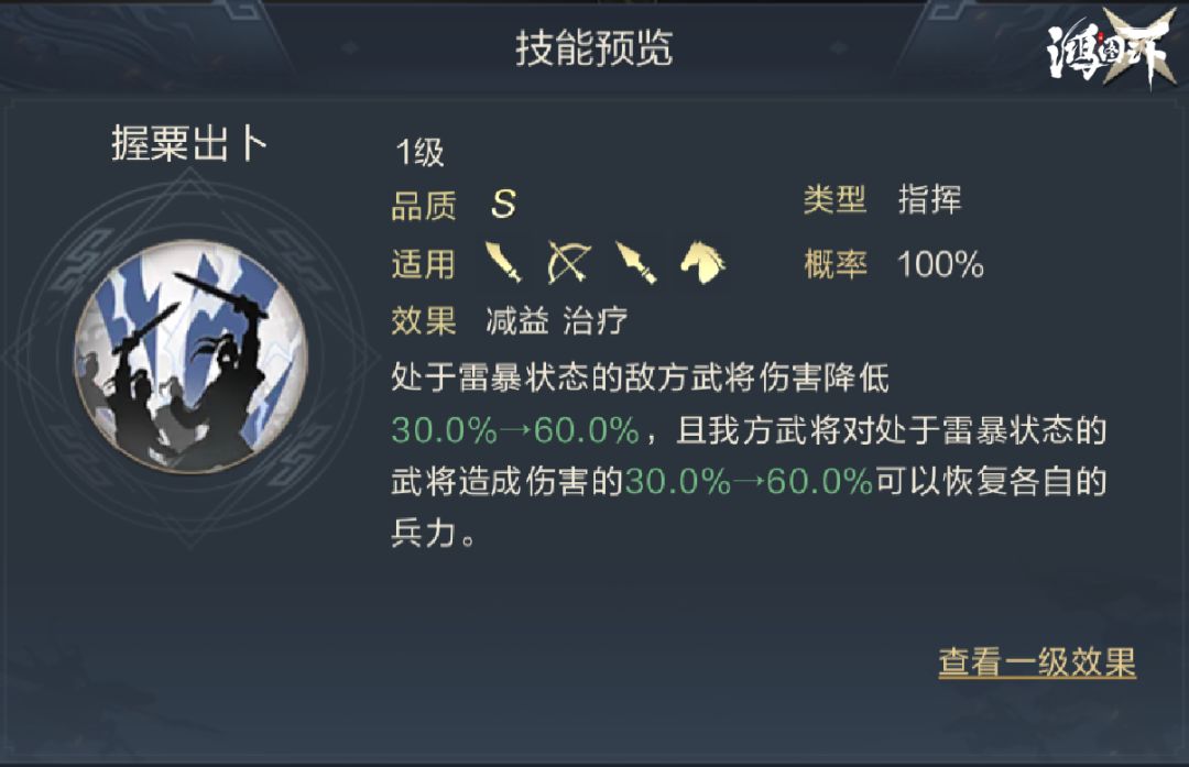张宁的技能对状态的要求比较具有针对性,该技能只与雷暴会产生效果触发,当对敌方施加雷暴后,会在持续时间内大幅降低处于雷暴的敌人所造成的伤害,而我方在对处于雷暴的敌人造成伤害时会根据伤害量恢复自身兵力。