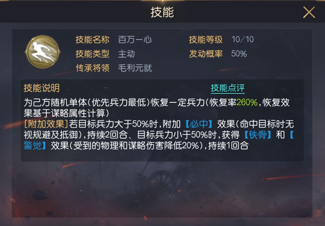三技能推荐百万一心,该技能可优先选择兵力最低的将领提供恢复,并根据兵力百分比提供输出增益或减伤增益,补充队伍续航的同时优化了两名将领的输出效率。