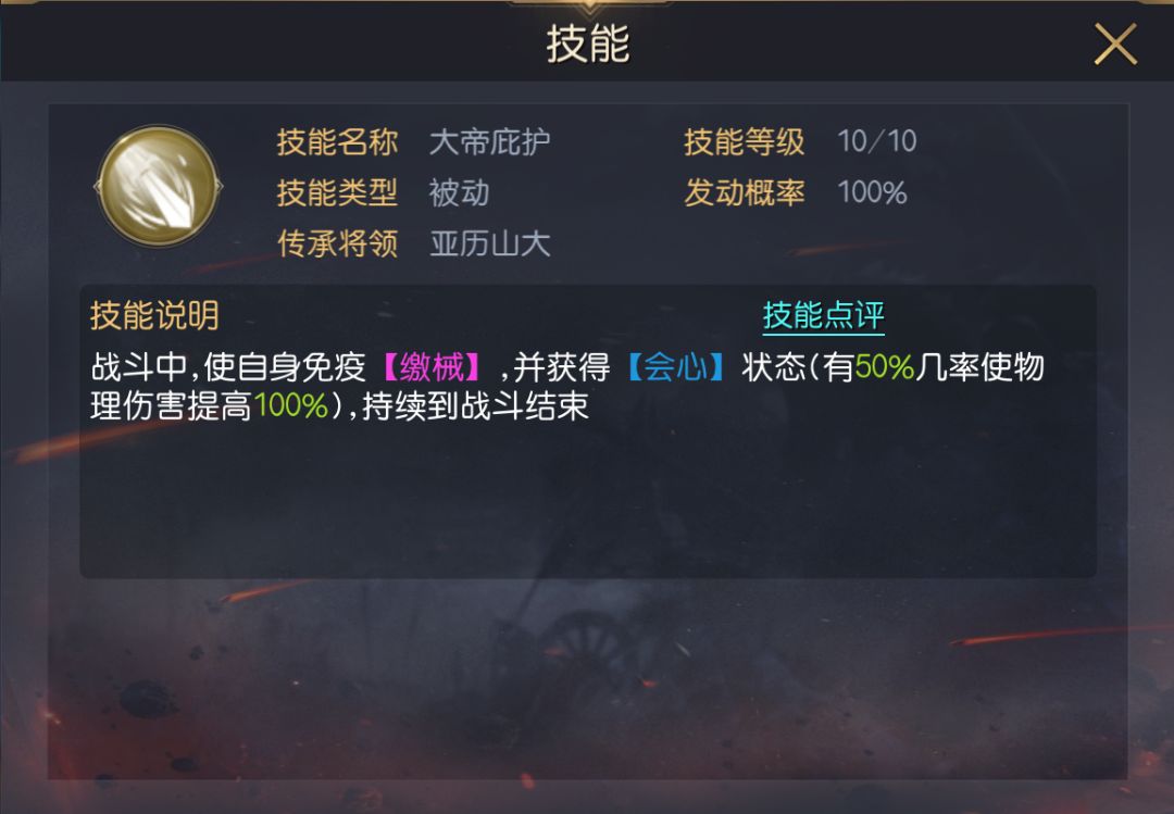 二技能推荐大帝庇护,该技能可让吕布全程免疫缴械,并获得50%的会心率,由于吕布的飞将为追击技能,他的主打输出方式也为追击,所以该技能的免疫效果能显著提升吕布普攻的稳定性,防止被缴械限制;会心率则提高了更高的爆发期望,与一骑当千注重前2回合的加成不同,大帝庇护在全程都能让吕布有几率造成更多伤害。