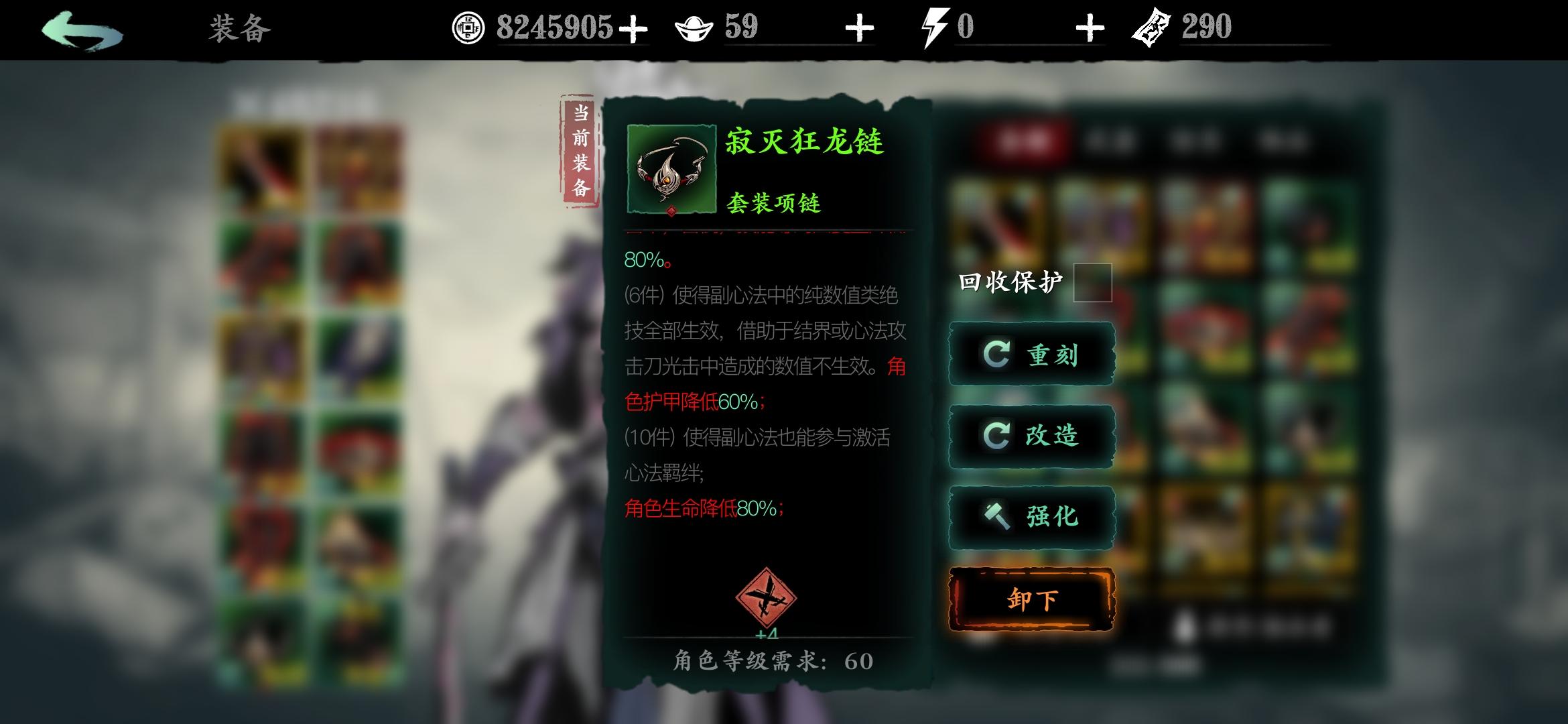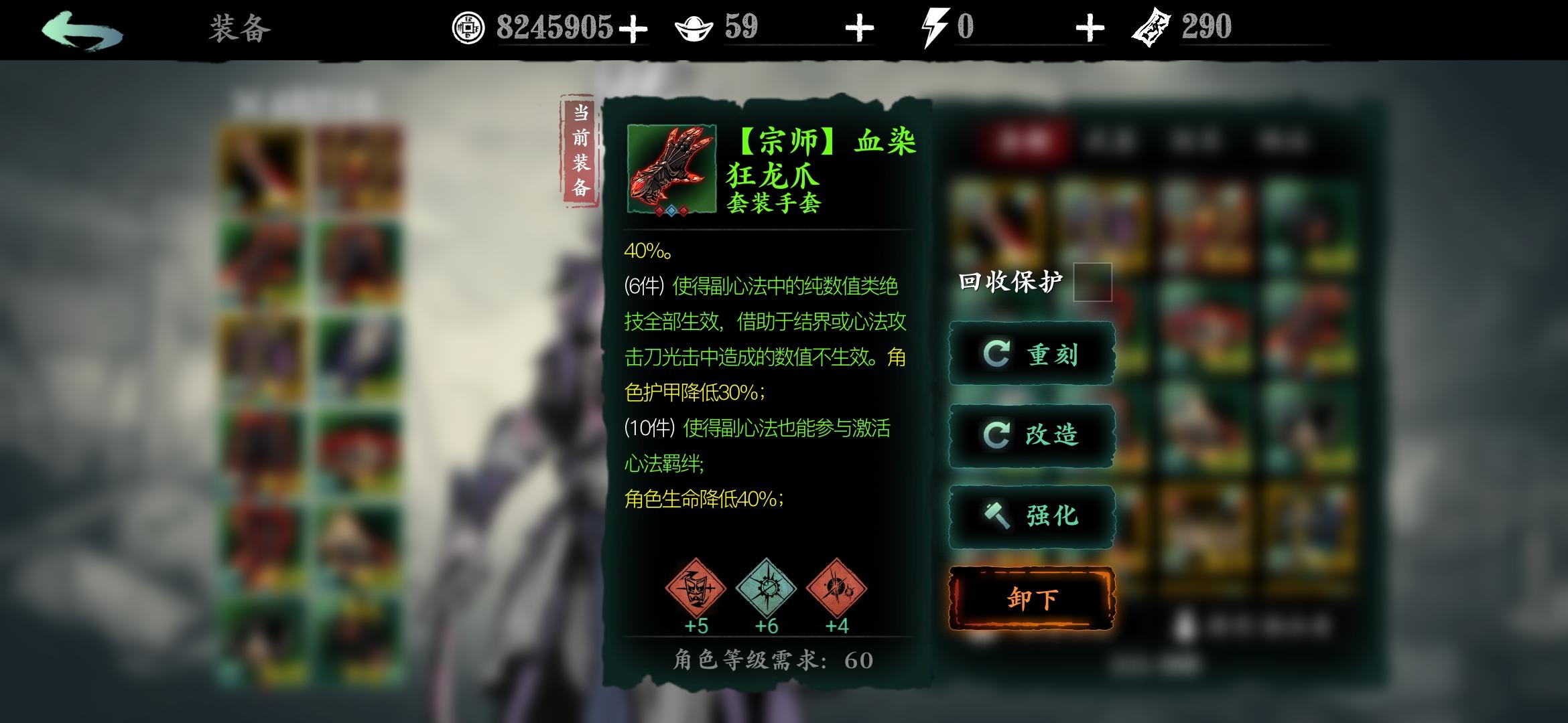 第一二三个图,是狂龙10件加魔堡羁绊,显示狂龙宗师狂龙10触发,剩下普通非宗师首饰3件是黑的,说明现在已经触发墨宝羁绊了,看技能链cd,确实是狂龙10效果,但是,第4第5个图,我下了一个狂龙首饰,面板显示狂龙10效果依旧触发,实际上10件效果已经失效,从cd就可以看出来。话大力气做出来7宗师加3普通狂龙,就是为了避免这个问题,结果因为bug,做了个寂寞,希望你们尽快修复。