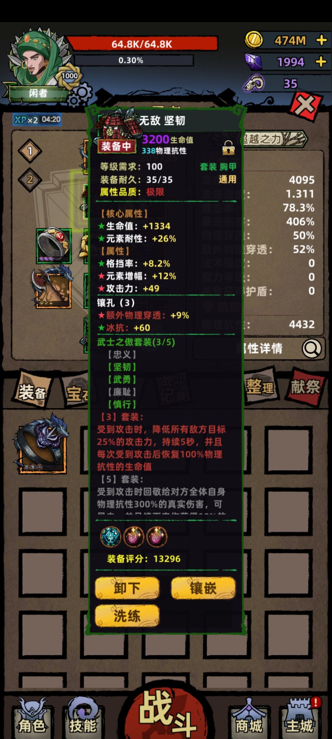 这套装备在保留人间护腿的情况下将人间套装更换为武士套装3件套,进一步提升生存能力。