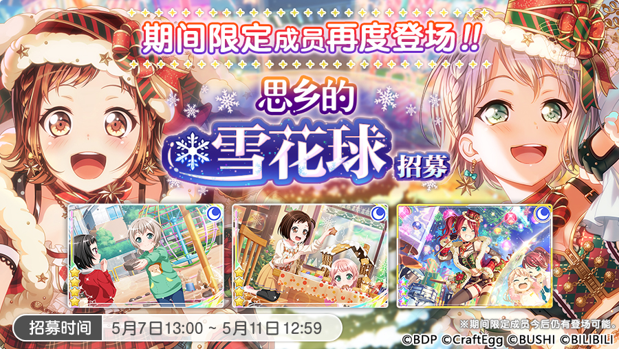 2.再度登场的「思乡的雪花球招募」期间限定成员仅会在「思乡的雪花球招募」及「思乡的雪花球 Special Set 10连招募」登场,且在招募结束后不再出现在其他招募中。