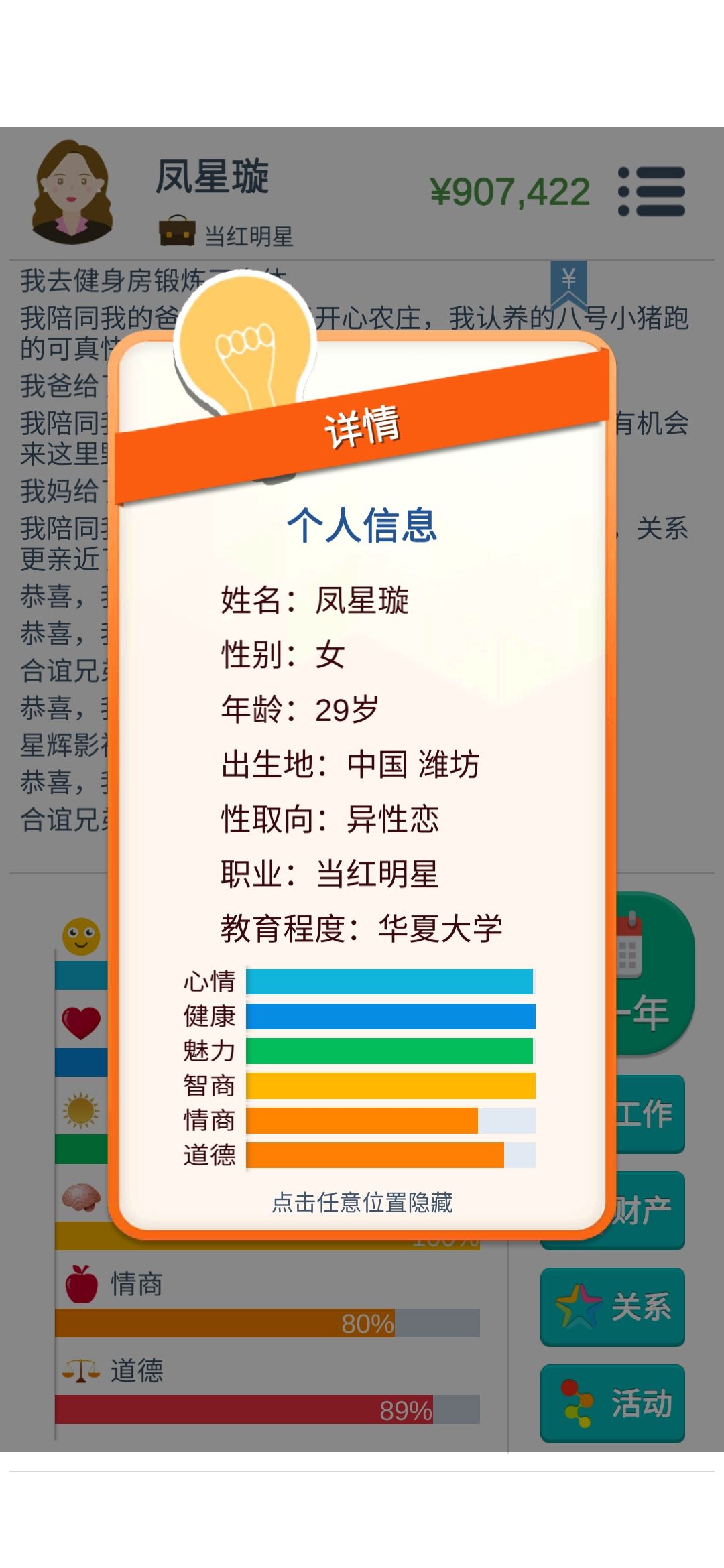 7.如果魅力值太低的开局我比较建议用子女来达成当红明星,前期太难整,可以找个工程师啥的年薪百万的,前期培养子女让子女的版面属性上去,然后遗嘱留子女名字,子女18岁时自杀,用子女来达成。